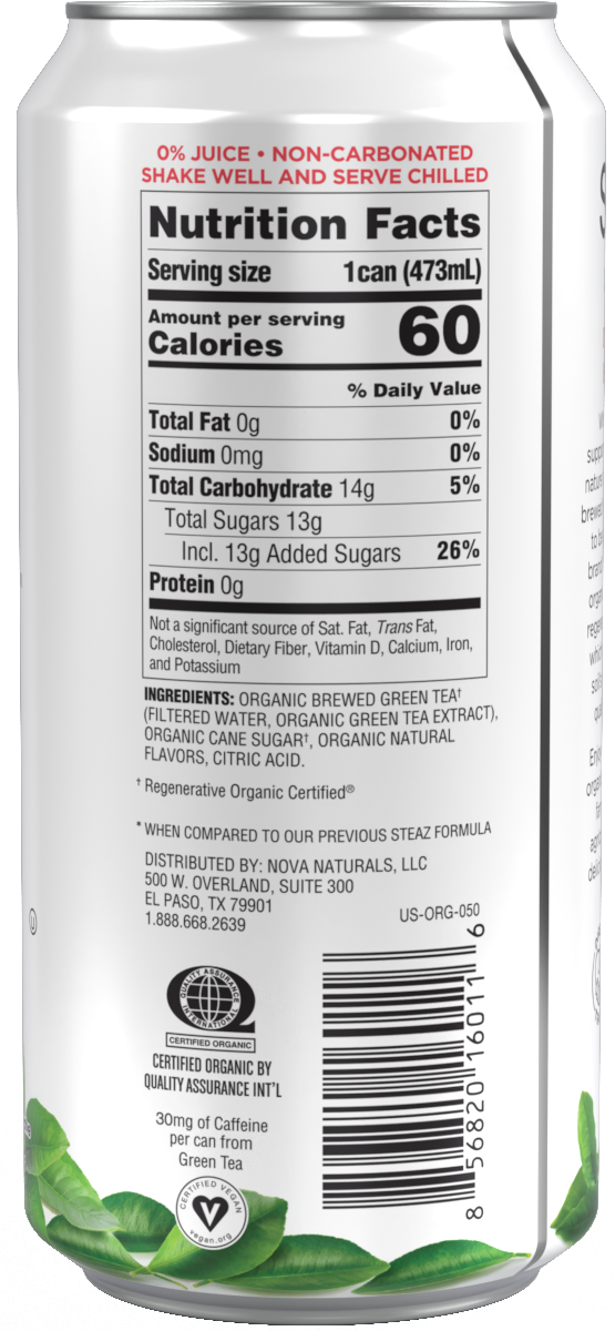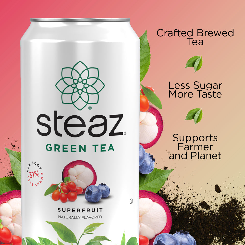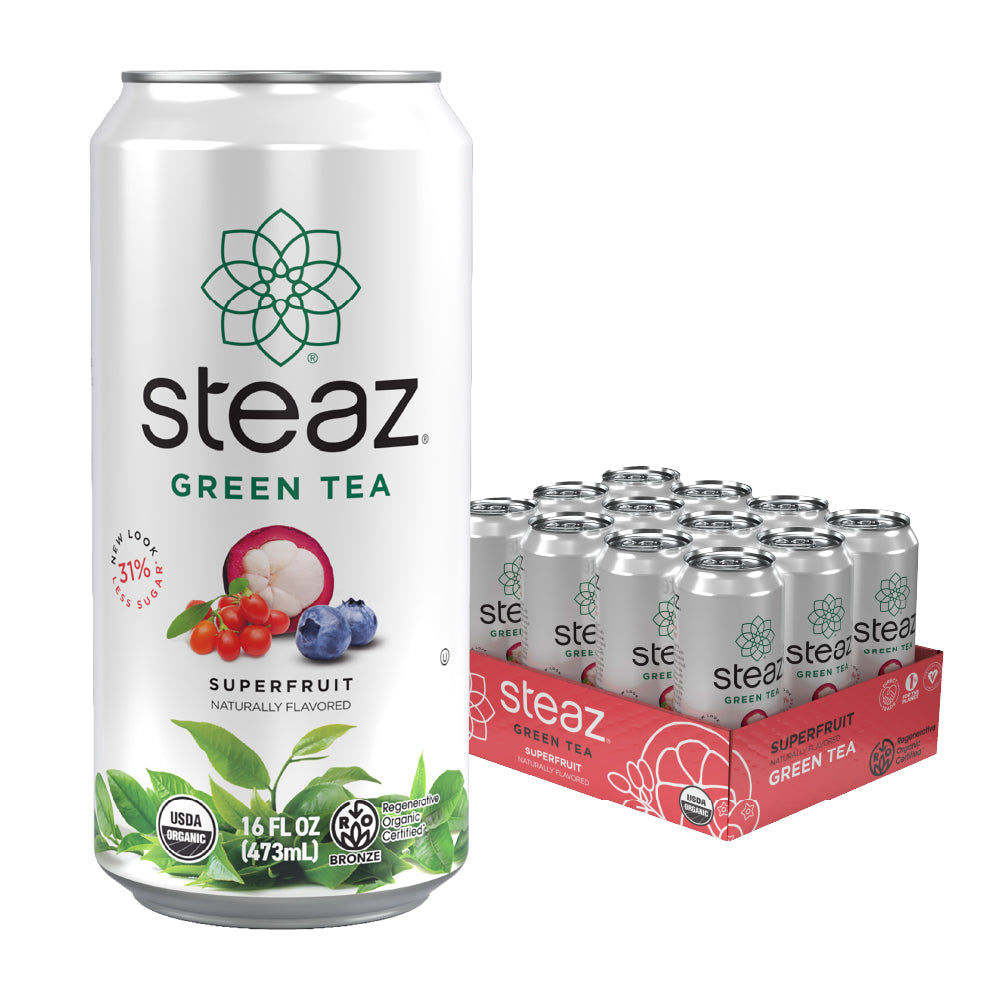 Crisp and refreshing, our Steaz Superfruit Green Tea is unique fruit blend brings together nature’s most vibrant superfruits in perfect harmony.